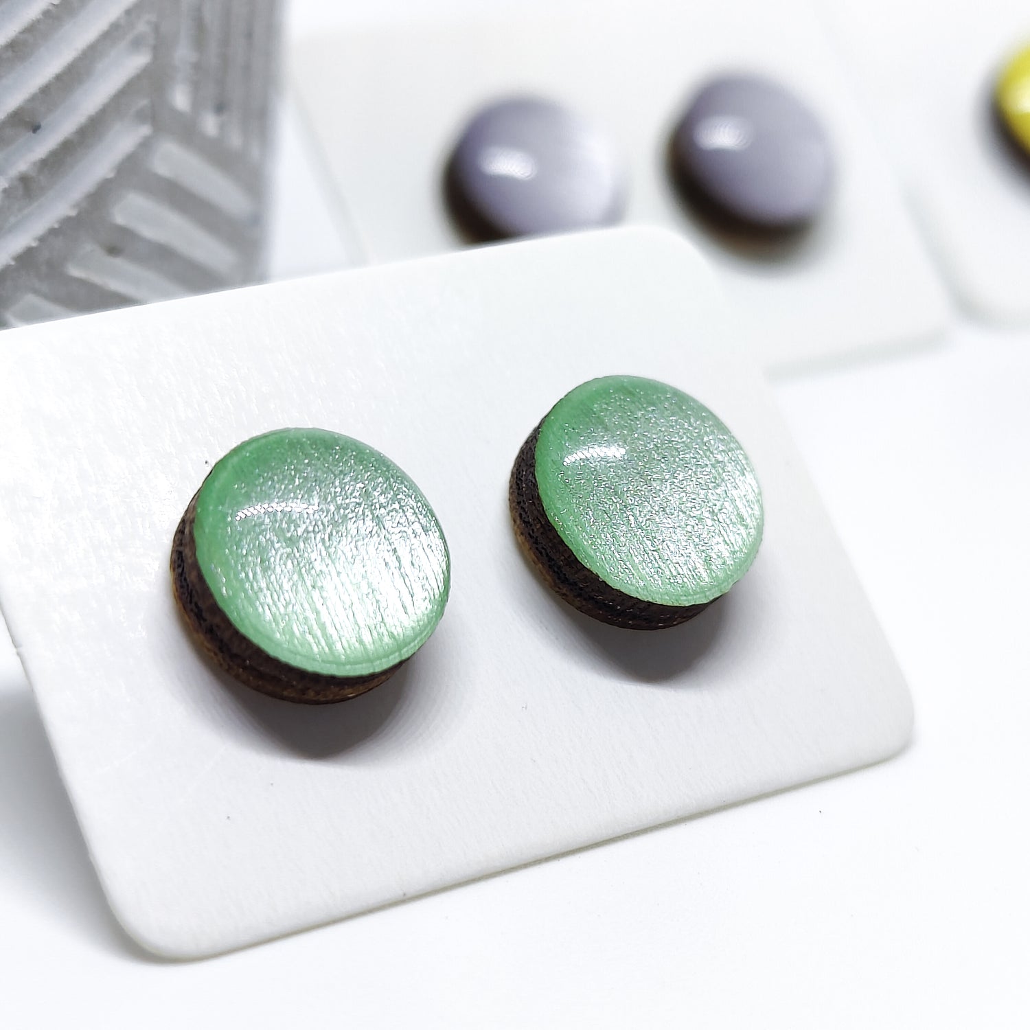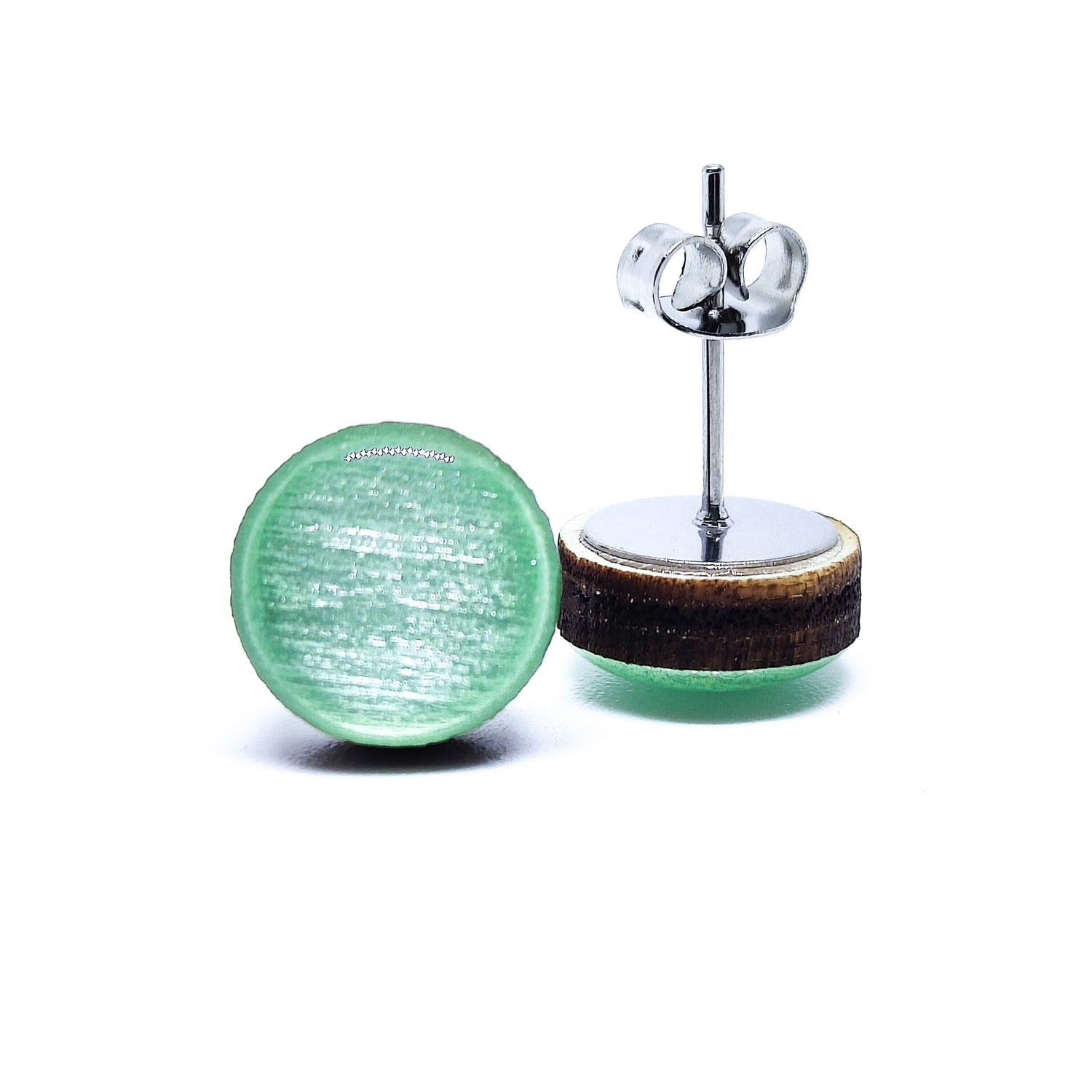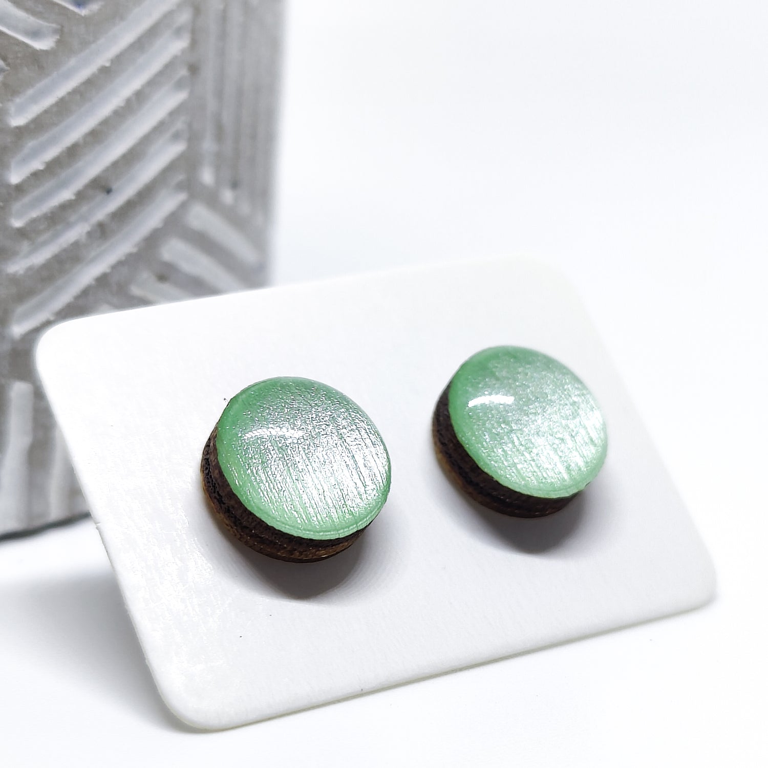 Mint Green Shimmer Stud Earrings | 10 mm Wood & Resin Earrings | Minimalist Simple Small | Girl Gift Women Gift | Stainless Steel Posts for Sensitive ears
